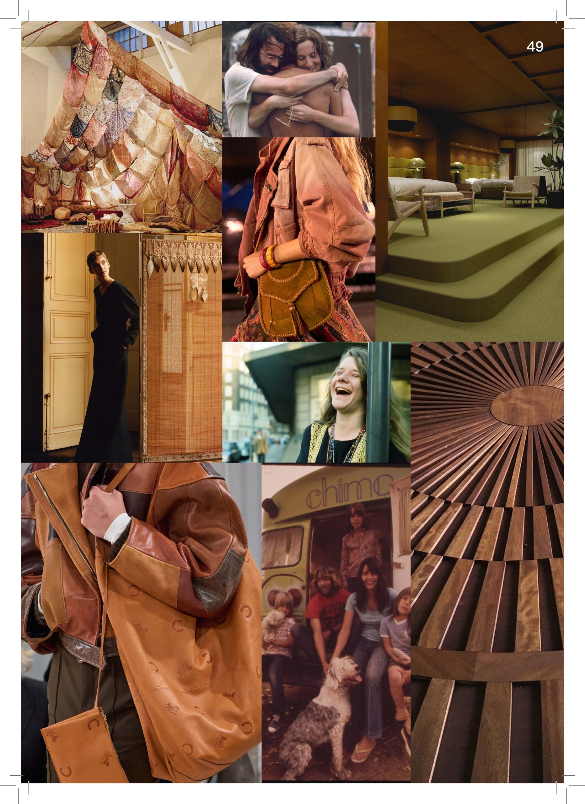 Rinasce lo spirito boho con un’estetica che celebra l’anima hippie e il gusto hart and craft degli anni ’70. I capelli phonati e le onde morbide incorniciano visi liberi, ispirati a icone come Janis Joplin e Stevie Nicks. Tuniche svolazzanti, pantaloni a zampa, abiti floreali e bluse di pizzo raccontano un’epoca di ribellione gentile. Ogni capo è un’opera artigianale: ricami, applicazioni, tessuti naturali. L’influenza di culture lontane, dal Navajo alle sete indiane, arricchisce un meltin’pot visivo e spirituale. Le zeppe, le hobo bag scamosciate e le collane di perline completano un look che è viaggio, lotta e sogno insieme.